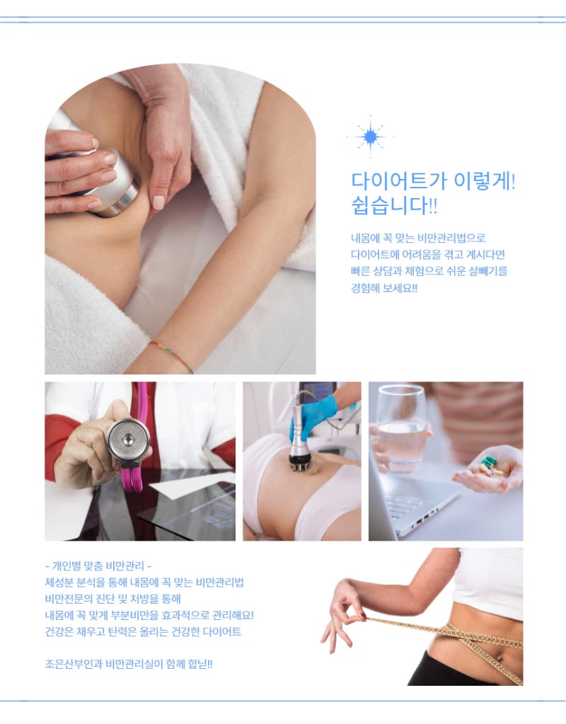 구미 비만 관리 내 몸에 딱 맞는 비만 프로그램으로 노폐물 배출뿐만 아니라 체중 감량을 효과적으로 완성합니다. [조은산부인과 비만관리실]