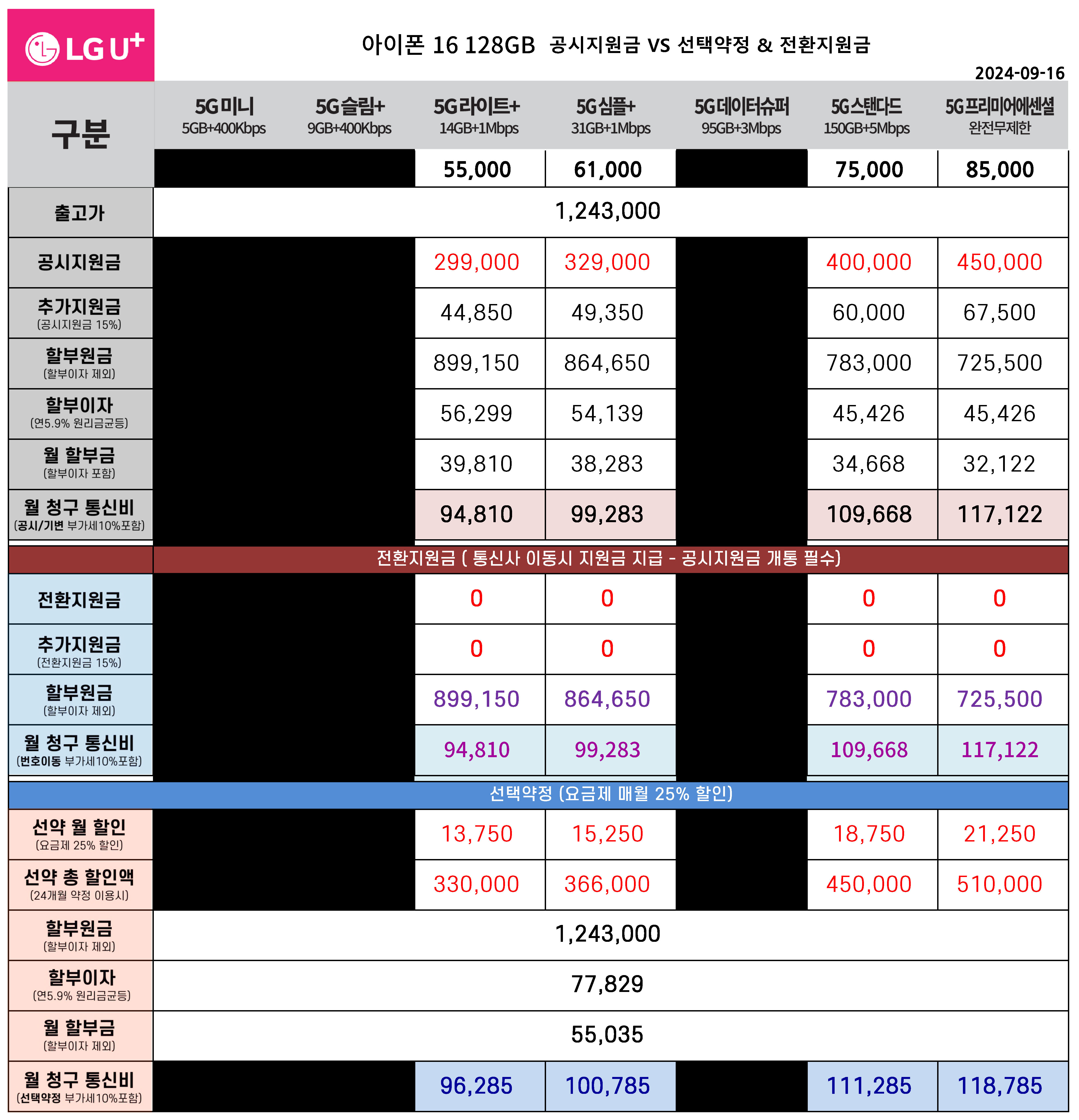 아이폰16 가격은 128GB 125만원, 256GB 140만원, 512GB 170만원이다. 성지지원금은 매장에 따라 다르지만 평균적으로 30만원에서 70만원 이상까지 혜택을 받을 수 있다. LG에서 구매하고 공시가가 55만원이면 공시지원금과 성지보조금을 모두 받을 수 있어 단말기 가격이 85만원에서 125만원 이상까지 할인된다. 이 경우 기본 128GB iPhone 16을 무료 휴대폰으로 얻을 수 있습니다.