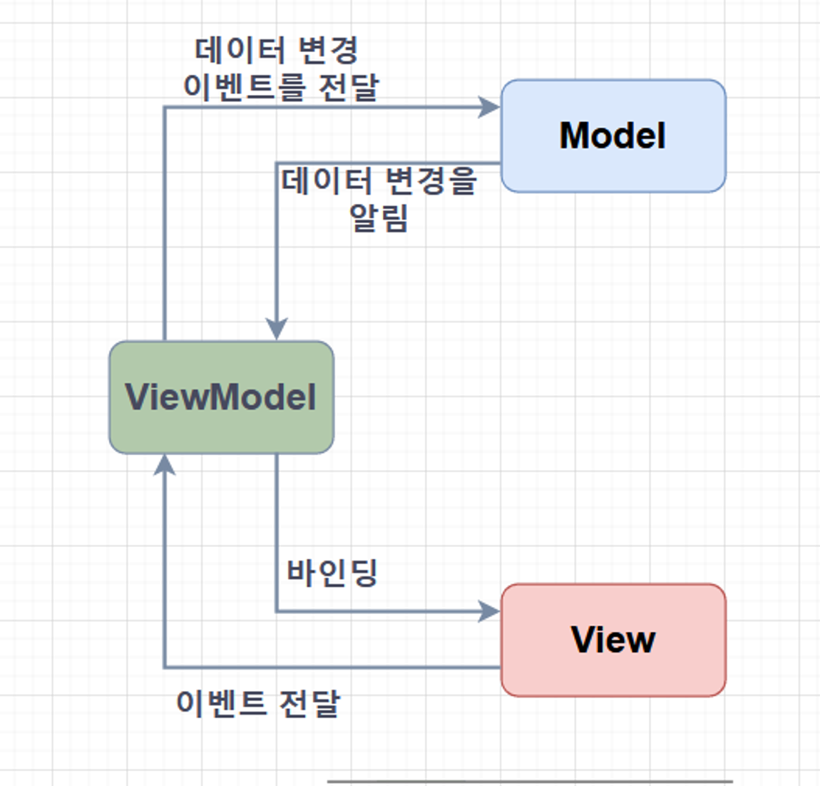 : View는 Model을 모르기 때문에 View Model을 관찰하다가 state가 변하면 전달된 state를 통해 화면이 업데이트 됩니다.